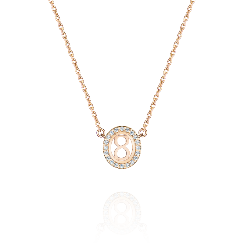 Elegant pendant on a chain with three levels of length in rose gold. The gold number in the center of the pendant is securely hidden by sapphire crystal and framed by a shining diamond scattering. The role of the figure here is conditional and ambiguous. It can be a password, a signal, or a symbol, the essence and meaning of which are known only to you.