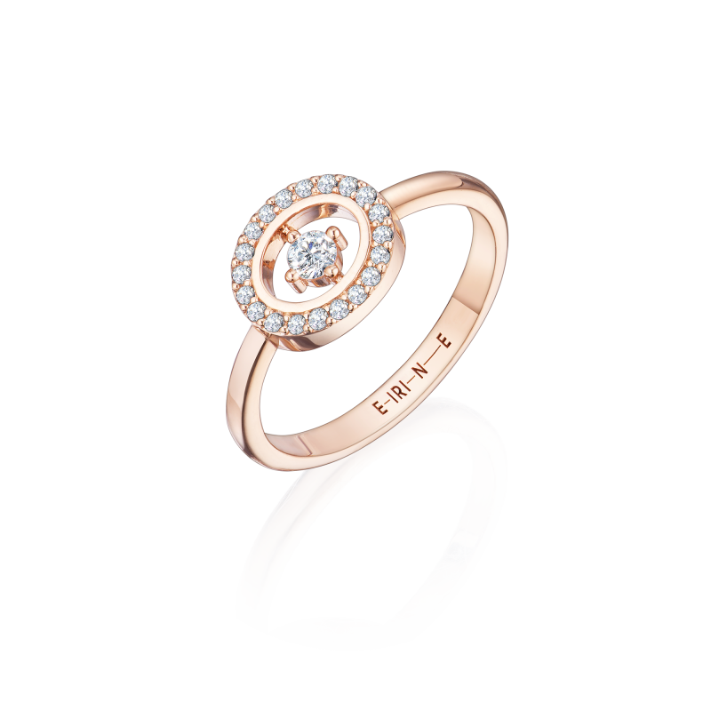 Classic rose gold ring. In the center is a magnificent floating diamond framed by a shimmering scattering of diamonds. The ring will be perfectly complemented by stud earrings and a diamond necklace in the same style.